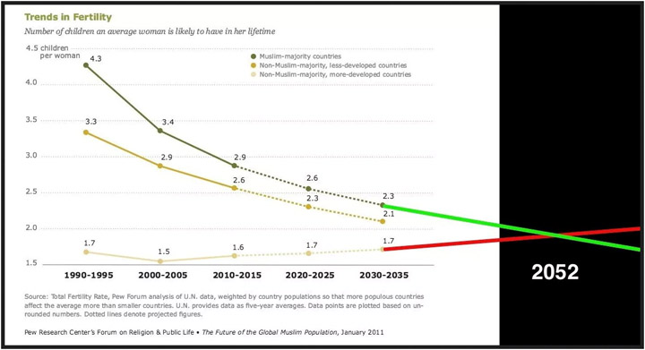 The REALITY is that white European birthrates are increasing, and Muslim birthrates EVERYWHERE are decreasing. By the year 2052, NON-MUSLIMS in the developed world will have a higher birthrate than Muslims.